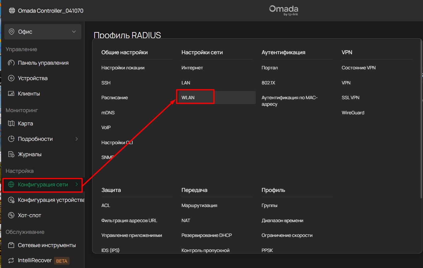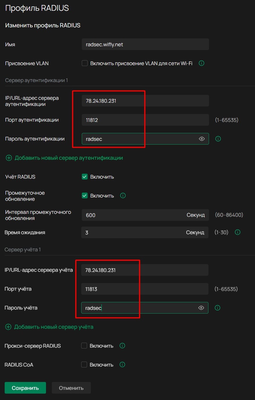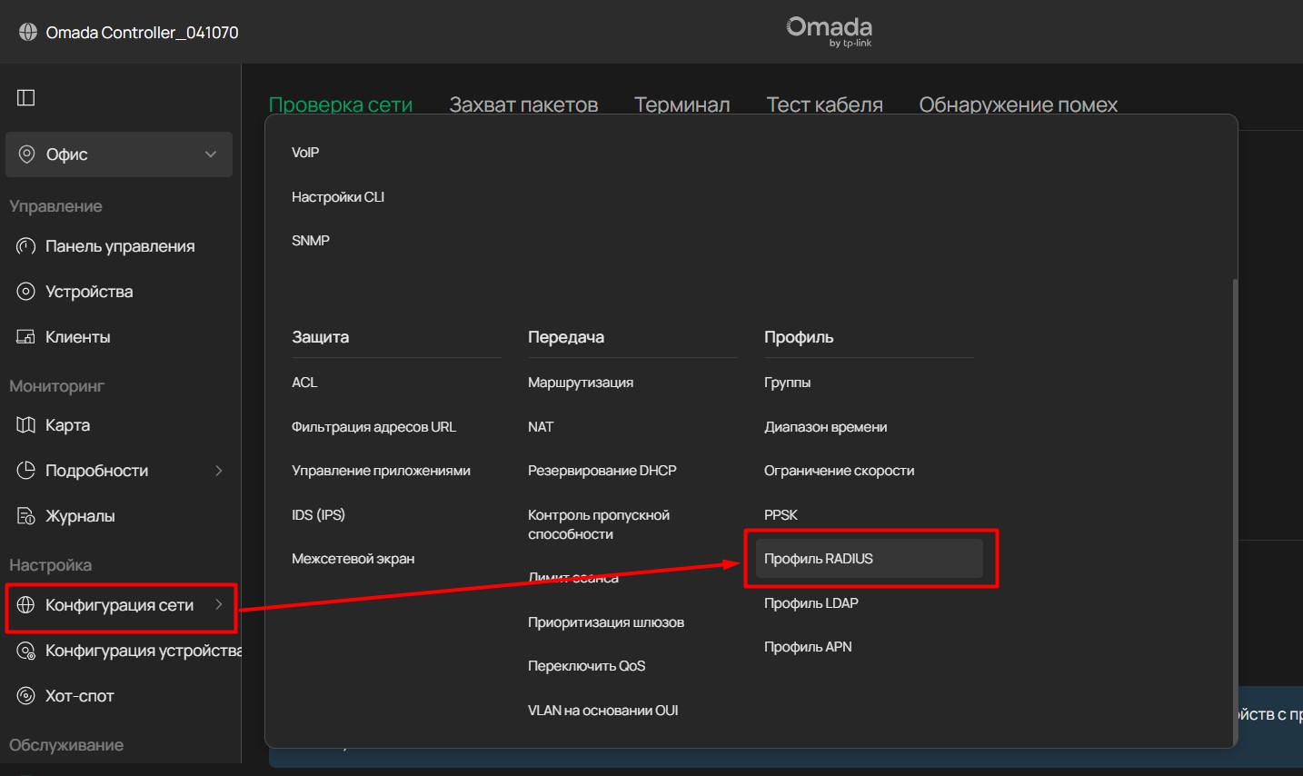 Перейдите в Настройки -> Профиль сети, нажмите Профиль RADIUS.