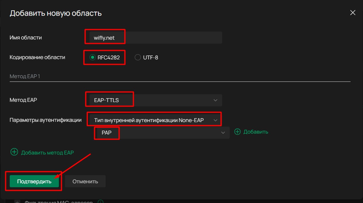 Параметры аутентификации выбираем: Тип внутренней аутентификации None-EAP с PAP в качестве параметра аутентификации